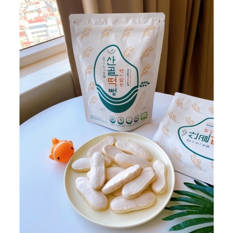- Mỗi chiếc bánh dài khoảng 9,5 - 10cm, dạng dẹt phù hợp để em tập cầm nắm. Bánh giòn xốp, dễ tan nên mẹ không lo em bị hóc nghẹn.