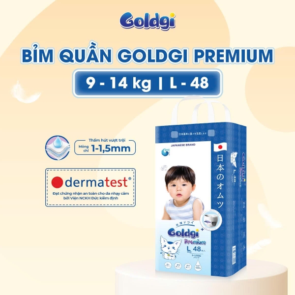 Bỉm - Tã quần Goldgi+ Premium size L 48 miếng cho bé 9 - 14kg đến từ Nhật Bản, sở hữu công nghệ hiện đại hiện nay với lõi hạt phân tử SAP liên kết chắc chắn giúp thấm hút siêu nhanh mà không gây vón cục bỉm. Tã Goldgi siêu mỏng chỉ 1.5mm tạo nên sự thoải mái và nhẹ nhàng khi bé sử dụng ngay cả vào mùa hè. Đai eo được kết cấu bởi 53 sợi thun đàn hồi, hai bên liên kết hàn siêu âm không sử dụng keo dính, không gây hằn đỏ da bé.