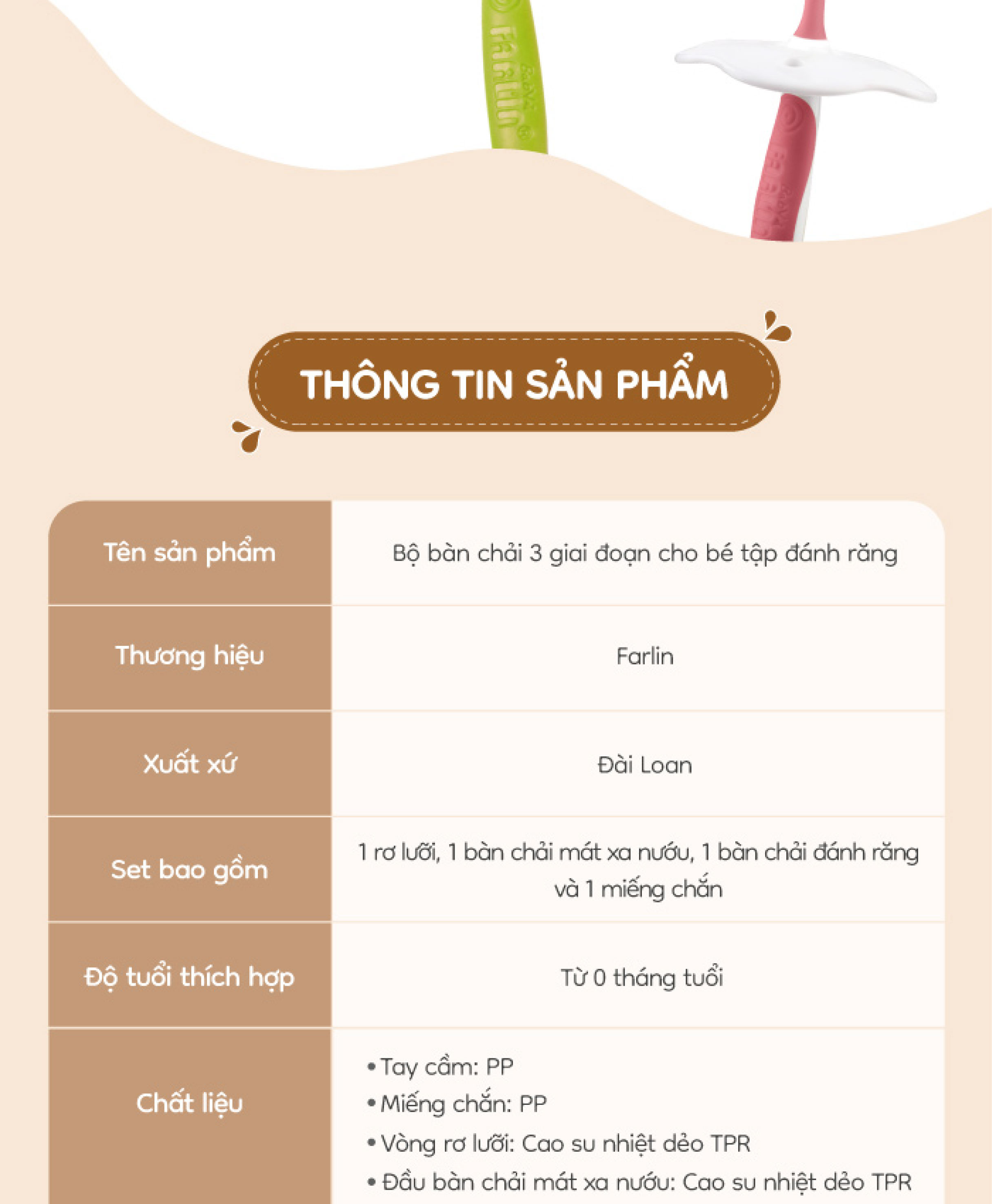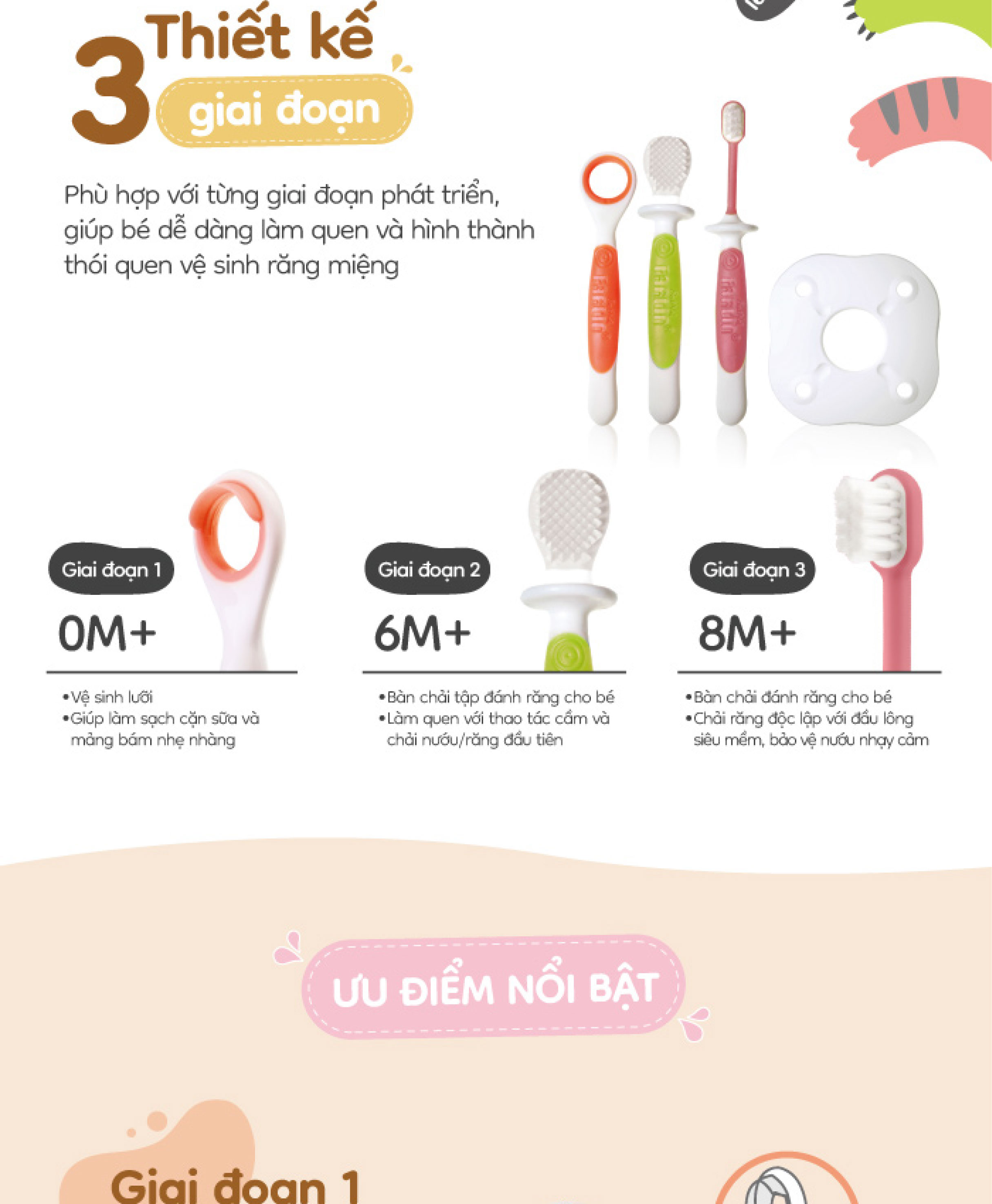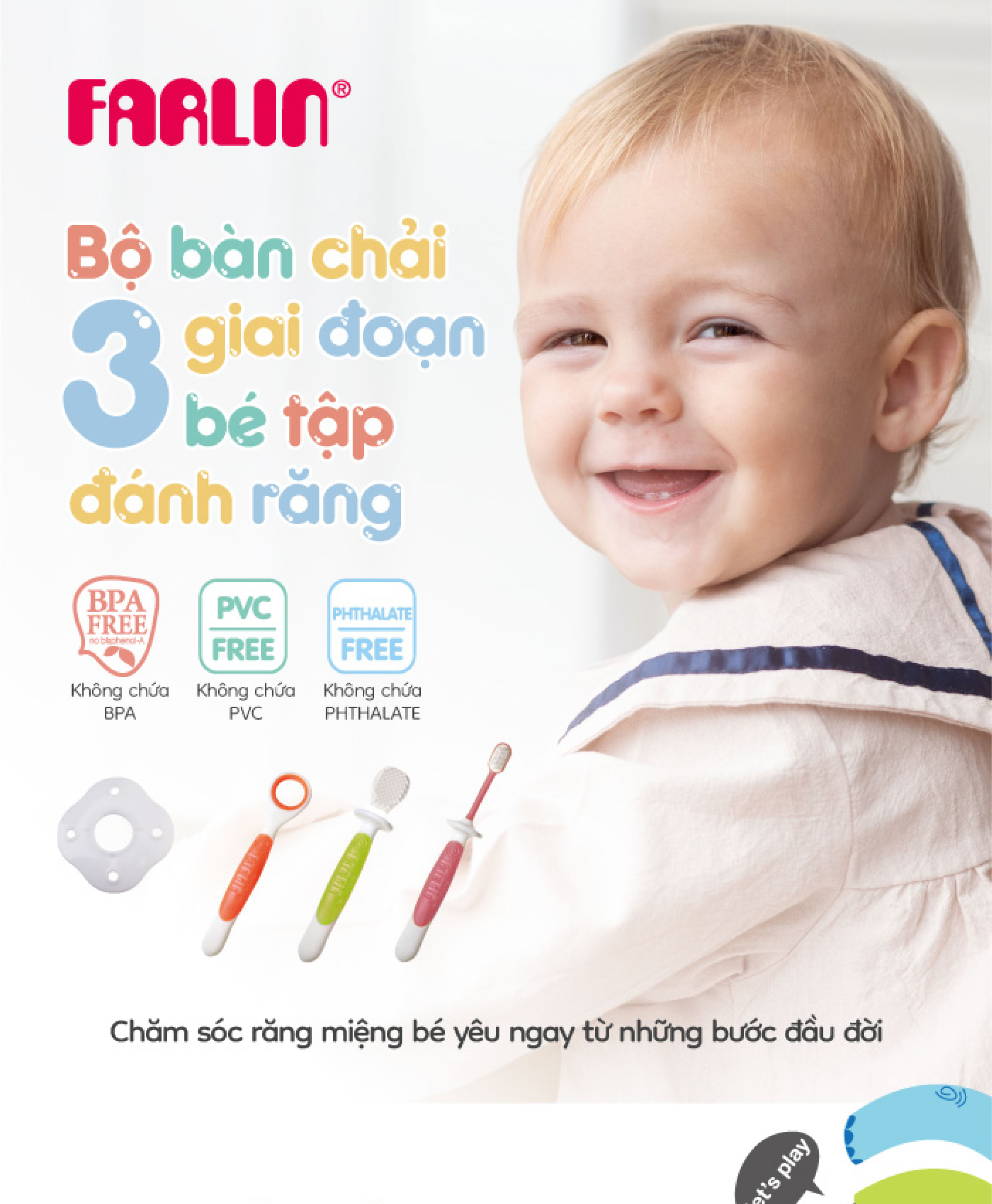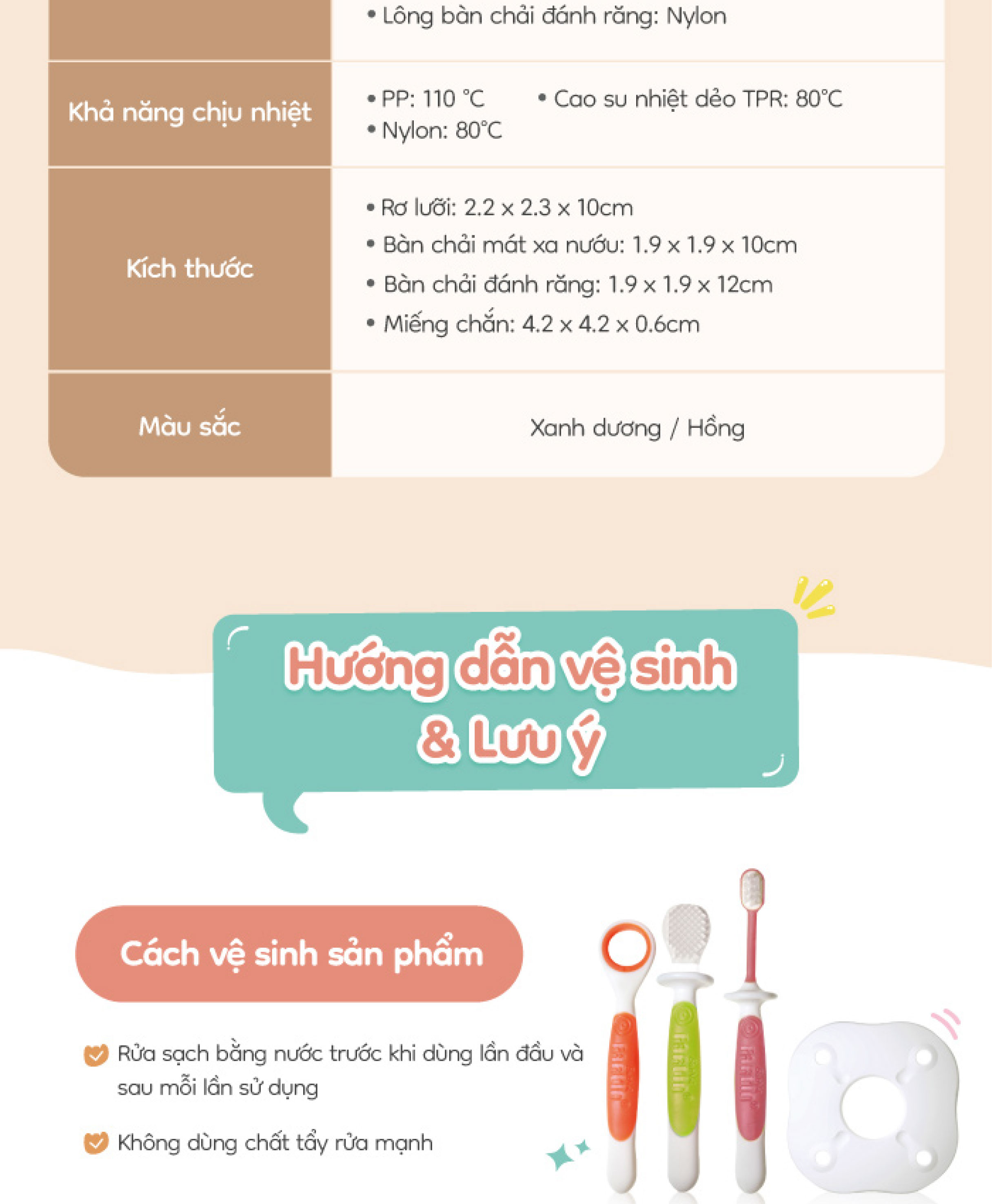 - Sản phẩm gồm bộ chăm sóc răng miệng 3 giai đoạn cho bé. Chất liệu an toàn với bé, không chứa BPA, Phthalate, chì.
