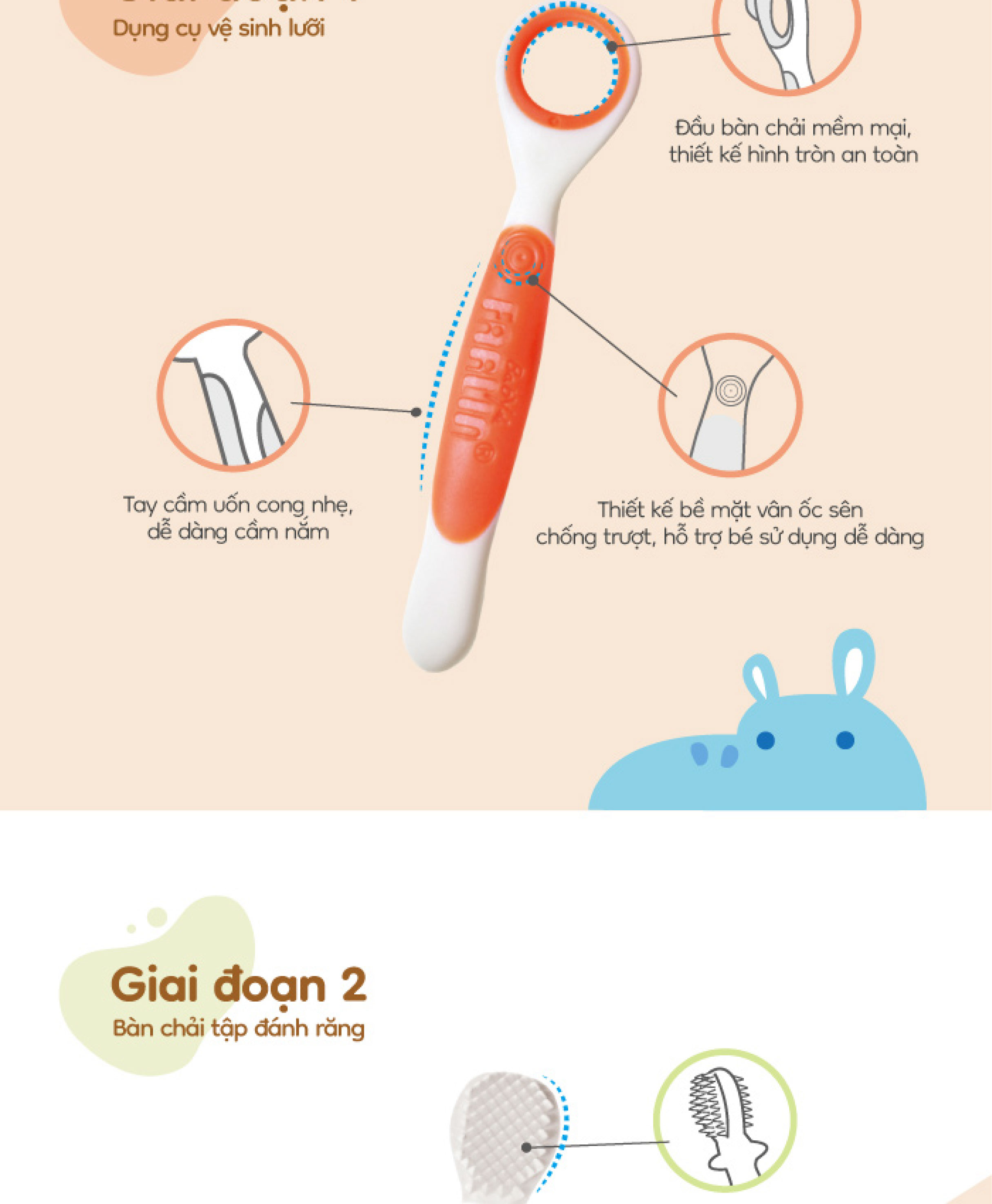 - Bàn chải giai đoạn 1 dùng để làm sạch lưỡi cho bé.