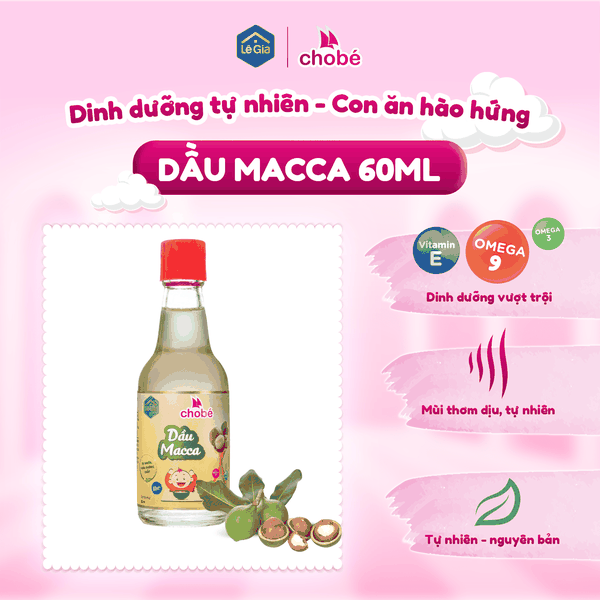 Trong giai đoạn ăn dặm, việc bổ sung dầu ăn cho bé là bước quan trọng để hỗ trợ phát triển toàn diện cả về thể chất lẫn trí tuệ. Với hàm lượng dinh dưỡng cao và hương vị thơm ngậy tự nhiên, dầu macca Lê Gia là lựa chọn lý tưởng để mẹ chăm sóc bé yêu một cách an toàn và khoa học.