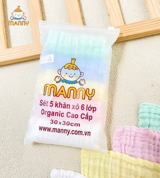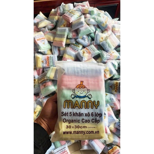 Set 5 Khăn xô màu Manny 6 lớp Organic cao cấp 30x30cm (Màu ngẫu nhiên)